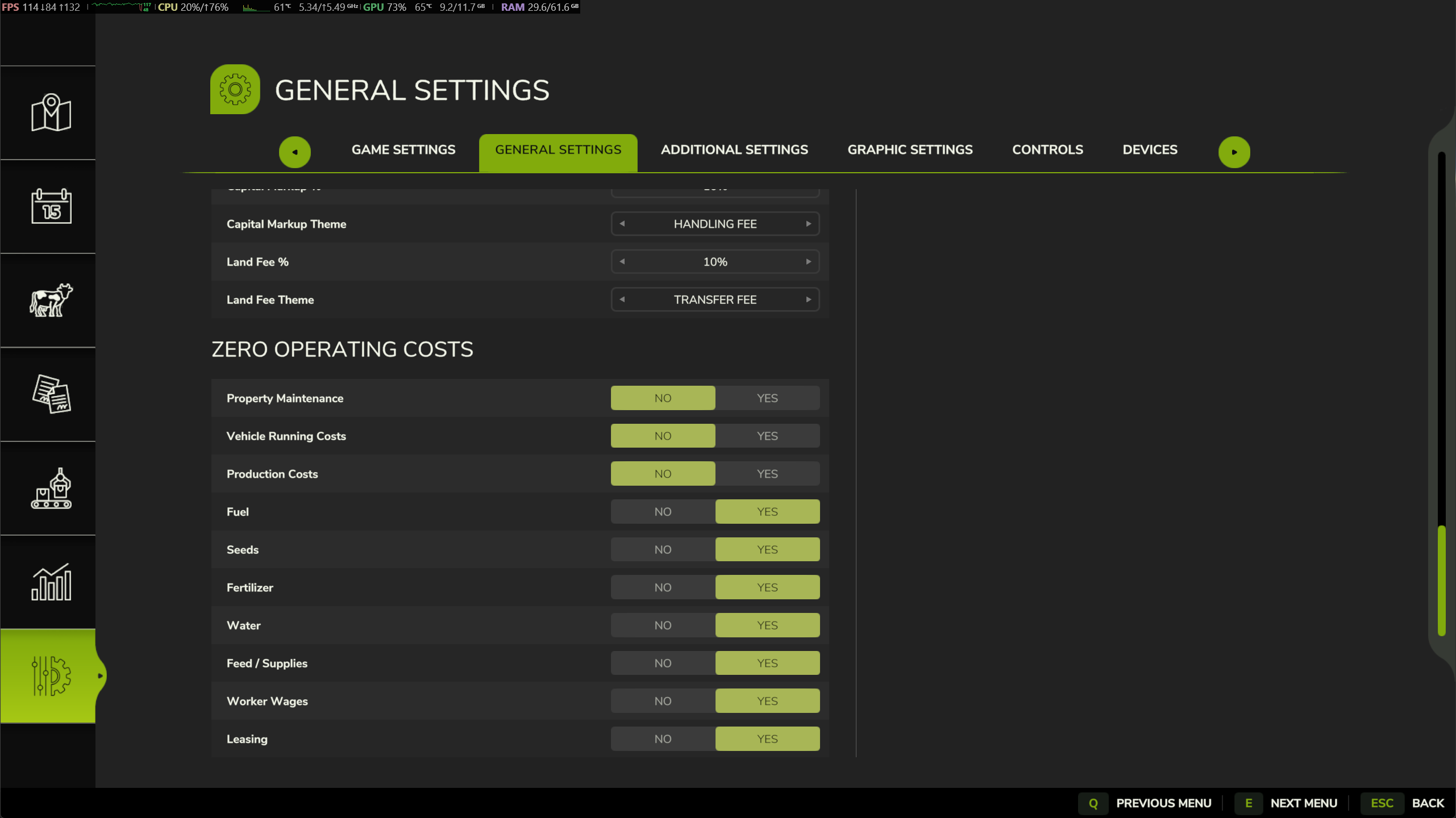 Zero Operating Costs lets you disable any combination of recurring farm expenses.